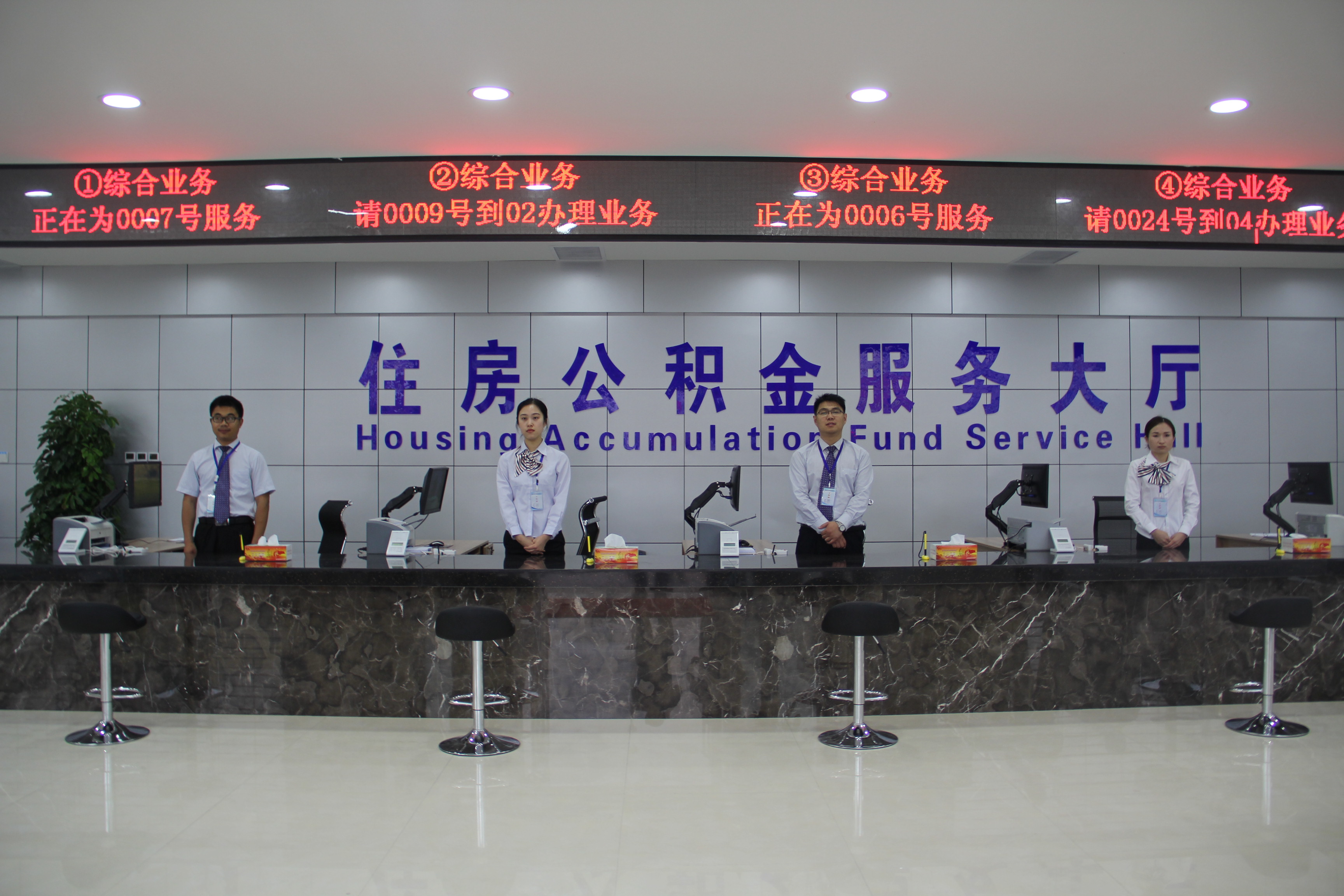 新建的服务大厅共设有归集、贷款、提取、农行、中行共9个服务窗口。大厅内设置了排号机、查询机、填单台、便民台、候办区、饮水机等设施,方便缴存职工办理业务。此外,大厅内还设置了大型LED显示屏和液晶屏幕,不定期滚动播放中心相关政策信息,提高了政策、程序透明度,拓展了信息宣传途径。官方网站和12329住房公积金服务热线为职工提供信息查询和业务咨询,进一步畅通了广大群众信息获得渠道。